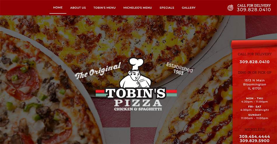 Tobin's Pizza has been a serving our community with fantastic food since 1963. Cybernautic® is one of the top Bloomington web design companies. Together, we worked on a vision to create a website that showed off their branding & story for the world to see!